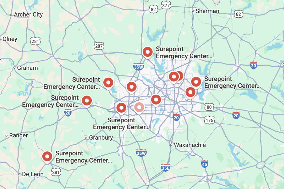 Whether you need immediate trauma care or rapid lab services, you can access high-quality, minimal-wait care at any of our convenient Texas facilities. With convenient 24/7 locations across the Dallas-Fort Worth metroplex, Padre Island, and surrounding Texas communities, Surepoint provides top-tier emergency room care right in your neighborhood.
